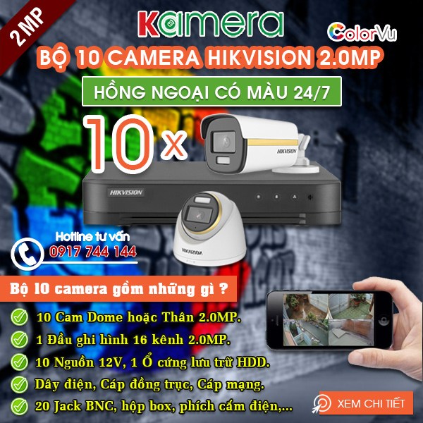 Trọn bộ 10 camera Hikvision ColorVu hồng ngoại ban đêm có màu, camera có độ phân giải Full HD 1080P, tầm quan sát hồng ngoại 30m, thích hợp lắp đặt trong phòng và lắp đặt trực tiếp ngoài trời, trọn bộ phù hợp lắp cho gia đình, cửa hàng, nhà trọ, văn phòng, tiệm vàng,..